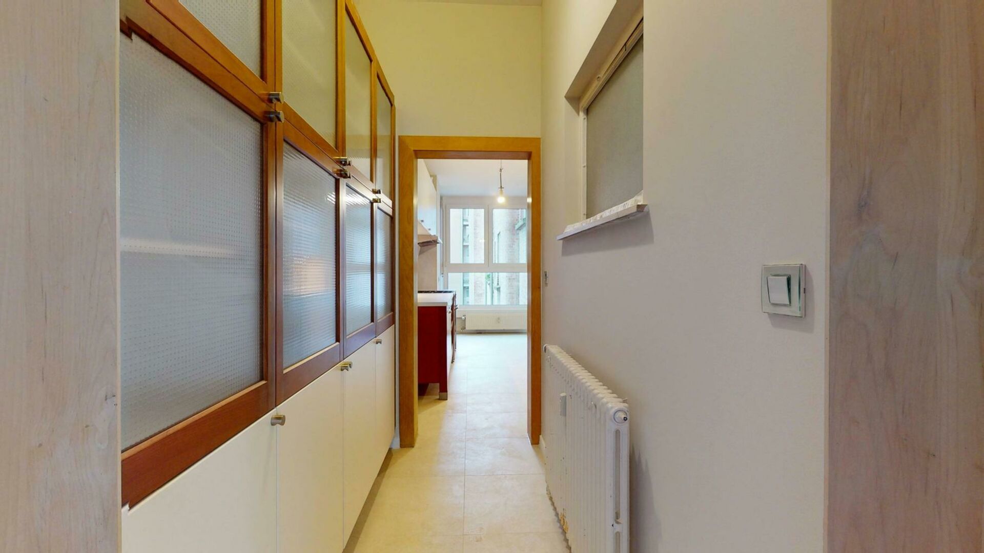 L’appartement se compose d’un vaste hall d’entrée ouvrant sur un vaste et lumineux séjour de +/- 50m² avec espace salle à manger. La cuisine séparée est entièrement équipée (taques de cuisson professionnelle au gaz, frigo, congélateur, lave-vaisselle, etc.) et bénéficie d’un coin à déjeuner ainsi que d’une arrière-cuisine pratique pour le rangement.