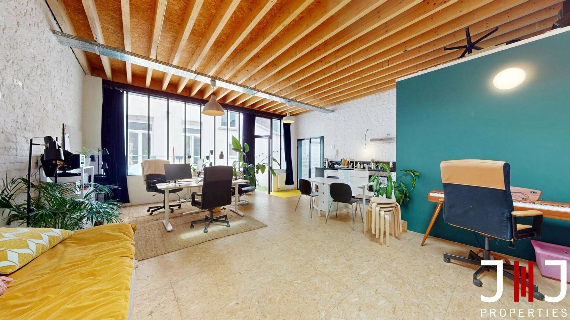 Développant une superficie totale d’environ 165 m², le bien se compose, au rez-de-chaussée, d’un séjour et d’une salle à manger en enfilade avec cuisine équipée, ouvrant sur une agréable cour privative orientée sud-est de 36 m². Cet espace extérieur dessert également un atelier indépendant de ±50 m², accessible aussi depuis la rue via une servitude, offrant de multiples possibilités d’aménagement : bureau, profession libérale, espace polyvalent ou revenu locatif supplémentaire.